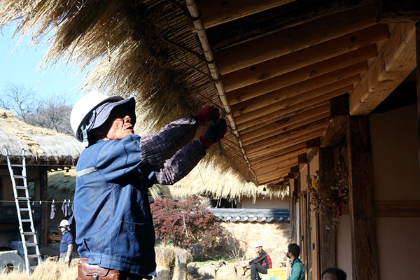 보은군은 매년 겨울을 앞두고 초가의 묵은 이엉을 걷어내고 새 볏짚으로 엮은 이엉을 지붕에 얹는다.