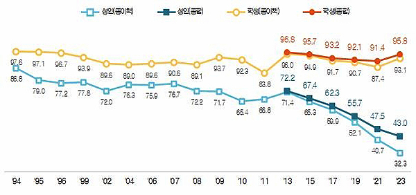 직전 조사 시점인 2021년 대비 4.5%포인트 감소한 것으로, 1994년 독서 실태조사(격년)를 실시한 이래 가장 낮은 수치를 기록했다.