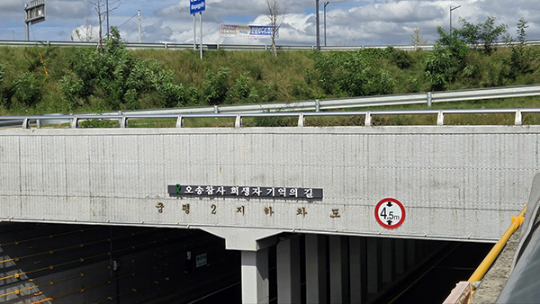 충북도는 15일 오전 이 지하차도 양방향 입구 상단 벽면에 가로 6m, 세로 30㎝ 크기의 추모현판 설치를 완료했다.