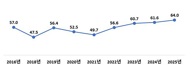 26일 문화체육관광부와 한국문화관광연구원이 발표한 '2025년 국민여가활동조사' 결과에 따르면 조사 참여자의 64.0%가 '매우만족', '만족', '약간만족'이라고 응답했다. 이는 지난해 대비 2.4%p(포인트) 상승한 것으로, 2016년 조사 이후 가장 높은 수치다.