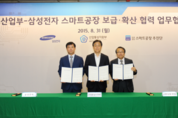 삼성과 산업부가 총 300억원을 공동 출연해 스마트공장의 보급과 확산을 추진한다. 정부가 ‘제조업 혁신 3.0 전략’의 일환으로 추진 중인 스마트공장 보급·확산사업에 삼성전자가 별도 출연을 통해 참여하기로 한 것이다. 삼성전자와 산업부, 민관합동 스마트공장 추진단(이하 스마트공장 추진단)은 31일 스마트공장 보급·확산을 촉진하기 위한 재원 출연과 사업추진 협력을 골자로 하는 업무협약(MOU)을 체결했다. 이 날 오전 대한상의에서 열린 업무협약식에는 이관섭 산업부 1차관, 김종호 삼성전자 사장, 박진우 민관합동 스마트공장 추진단장 등이 참석했다. 이번 업무협약에 따라 삼성전자와 산업부는 2016년부터 2년간 각 150억원씩, 총 300억원의 재원을 출연해 2017년까지 600개 이상의 중소기업에 스마트공장을 육성할 계획이다. 삼성전자는 스마트공장 추진단에