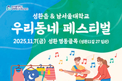 [문화투데이 장은영 기자] 남서울대는 다음 달 7일 충남 천안시 성환읍 명동 골목 일대에서 '우리 동네 페스티벌'을 연다고 31일 밝혔다. 이번 행사는 대학과 지역이 상생하며 생활권 내 문화와 경제의 활력을 높이기 위한 학생 참여형 사회공헌 프로그램이다. 주요 프로그램으로 충남 지역 소상공인의 수공예품과 팝업스토어로 구성된 우리 동네 프리마켓, 대한적십자사 성환봉사회와 연계한 먹거리 나눔 및 로컬 푸드트럭, 남서울대 학생들의 전공 역량을 살린 공실 팝업스토어 등이 운영된다. 공실 팝업스토어에서는 양궁 체험, 커피박 재생 아트, LED 타악기 제작, 캐리커처, 아트 전시, 페이스페인팅 등 다양한 체험 프로그램이 마련된다. 프리마켓과 함께 진행되는 야외무대에서는 주민들이 참여하는 통기타·하모니카 공연 등 생활문화 무대와 남서울대 실용음악학과 재학생들이 선보이는 우리 동네 음악회가 열려 축제의 분위기를 더할 예정이다.