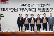 [문화투데이 장은영 기자] 충남도는 9일 도청 문예회관에서 15개 시·군과 도민 등 1천800여명이 참석한 가운데 '대전·충남 행정통합 범도민 촉구대회'를 열고, 지난 10월 발의된 대전·충남특별시 설치 및 경제과학수도 조성을 위한 특별법안의 조속한 국회 본회의 통과를 촉구했다. 정재근 대전·충남 행정통합 민관협의체 공동위원장은 '대전·충남 행정통합, 균형 발전과 국가 혁신의 시작'을 주제로 한 기조발언을 통해 "대전·충남 행정통합은 가장 실효적인 초광역 정부 모형으로, 정부의 균형 성장 전략과 일치한다"고 강조했다. 이어 바르게살기운동 충남도협의회, 충남도 정책특별보좌관, 충남도 자율방재단연합회, 충남도 자율방범연합회, 충남도 의용소방대연합회, 이·통장협의회 충남도지부 등 7개 단체가 220만 도민과 140만 대전시민의 염원을 담은 대전·충남 행정통합 결의문을 낭독했다. 김태흠 충남지사와 도민 대표들은 대전·충남 지도 모양의 퍼즐 조각들을 모아 대전·충남특별시로 완성하는 퍼포먼스도 펼쳤다. 김 지사는 "이제는 전국을 5∼6개 권역으로 헤쳐 모아 제 기능을 다하는 초광역 발전모델로 대수술을 해야 할 때"라며 "먼저 대전·충남부터 시작하고 장차 세종·충북까지