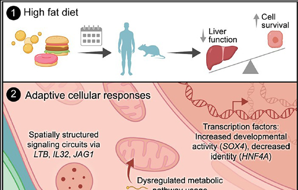 간세포(hepatocyte)가 장기간 고지방 식단에 노출되면 줄기세포 같은 미성숙 상태로 되돌아가 암을 유발할 수 있는 돌연변이 등에 더 취약해진다는 연구 결과가 나왔다. 미국 매사추세츠공대(MIT) 의공학·과학연구소(IMES) 알렉스 샬렉 교수팀은 최근 과학 저널 셀(Cell)에서 고지방 먹이로 간질환을 유발한 생쥐 모델과 간질환 단계별 환자의 간세포 표본 연구를 통해 이런 사실을 확인했다고 밝혔다. 연구팀은 성숙한 간세포는 고지방 식단에 반응해 미성숙한 줄기세포 유사 상태로 되돌아간다며 이런 변화는 고지방 식단으로 인한 스트레스 환경에서 세포가 살아남는 데는 도움이 되지만 장기적으로는 암 발생 위험을 높인다고 말했다. 이어 이런 세포 회귀 현상(cell reversion)을 조절하는 것으로 보이는 여러 전사인자를 규명했다며 이런 요인들이 고위험 환자에서 종양 발생을 예방하기 위한 약물의 표적이 될 수 있을 것이라고 덧붙였다. 고지방 식단은 간에 염증과 지방 축적을 초래, 대사이상 관련 지방간염(MASH)을 일으킬 수 있고, 이는 간경화와 간부전, 간암으로 이어질 수 있다. 연구팀은 기존 연구들은 고지방 식단의 간세포 사멸 유도에 초점을 맞춰 살아남은 간세