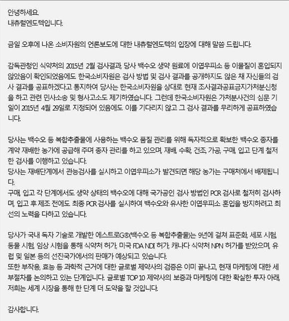 한편, 내츄럴엔도텍은 연구 소장이 참석한 기자회견을 열고 한국소비자원이 발표한 의혹을 강하게 부인했다.