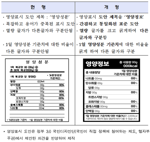 식약처 관계자는 "소비자가 식품의 영양성분 함량을 보다 쉽게 이해하고 활용할 수 있도록 표시단위 및 표시도안 등을 개선하는 등 영양표시기준을 합리적으로 개선해 소비자에게 정확한 정보 전달 및 제품 품질 향상을 도모하고 관련 규정과의 조화를 위해 개선·보완하고자 한다"고 말했다.