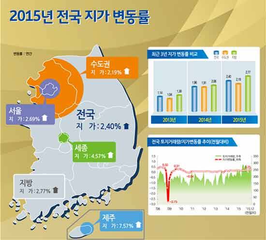 땅값의 2.4% 상승은 연간 지가변동률은 지가가 하락했던 2008년 금융위기 이후 가장 높은 수준으로 2010년 11월부터 62개월 연속 상승한 것이다.