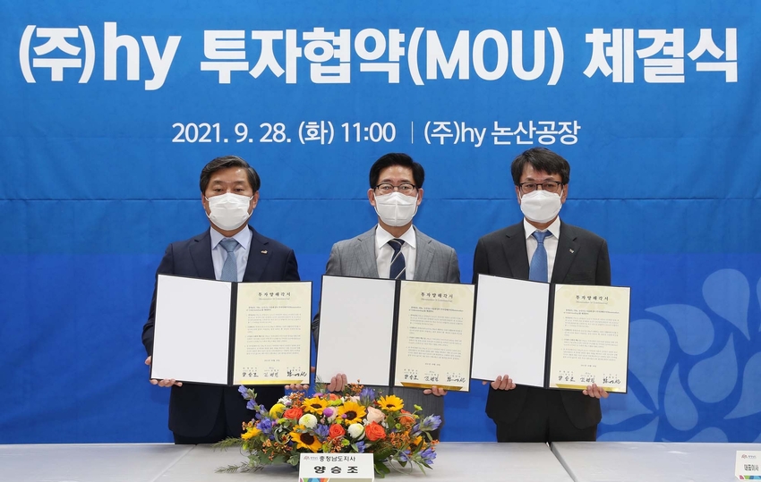 양승조 지사는 28일 hy 논산공장에서 황명선 논산시장, 김병진 hy 대표이사와 함께 투자협약(MOU)을 체결했다.