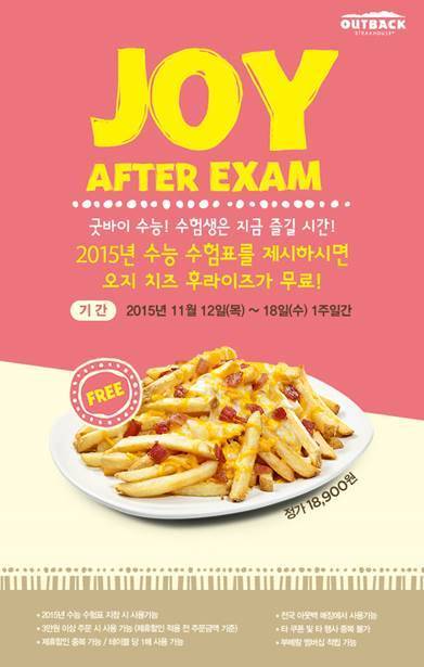 이번 이벤트는 수능시험 당일인 12일부터 18일까지 일주일 동안 진행된다. 이벤트 기간 동안 2015년 수능 수험표를 지참하고 아웃백 매장에 방문하면 오지 치즈 후라이즈(정가 18,900원)를 무료로 제공한다.