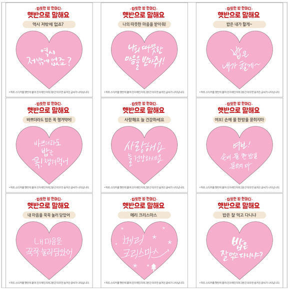 햇반이 제작한 마음스티커는 평소에는 문구가 보이지 않다가, 햇반에 부착해 전자레인지에 2분 정도 가열하면 나타나는 특수 스티커다. “나의 따뜻한 마음을 받아줘!”, “내 마음을 꾹꾹 눌러 담았어” 등 총 아홉 종류의 문구로, ‘밥’에서 느낄 수 있는 가치와 소중한 사람에게 전하는 말을 재치 있게 표현했다.