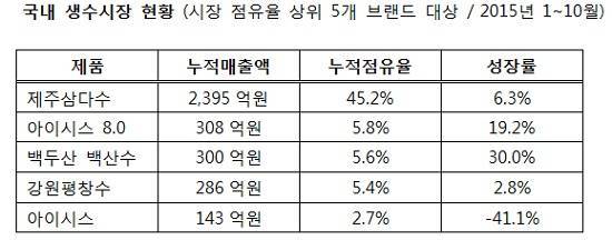 2015년 생수시장 점유율 1위는 삼다수다. 45.2%의 점유율로 지난해보다 6.3% 성장했다. 가장 많은 성장세를 보인 업체는 농심이다. 농심 백산수는 30%, 아이시스 8.0은 19.2%의 성장을 했다.