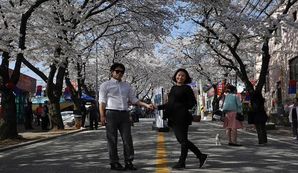 '청풍호 벚꽃축제'가 8일부터 10일까지 제천시 청풍호에서 열린 가운데 시민들이 벚꽃길을 걷고 있다.