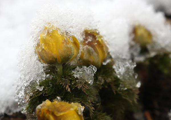 밤사이 눈이 내린 14일 강원 강릉시 외곽의 숲속에서 황금색 꽃망울을 터트린 복수초가 흰 눈에 덮인 채 봄을 기다리고 있다.