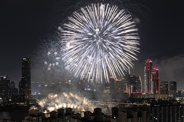 [연합뉴스] 7일 저녁 어두운 서울 밤하늘이 10만여발의 불꽃으로 환히 밝혀지는 순간마다 환호성과 감탄이 일제히 터져 나왔다.
