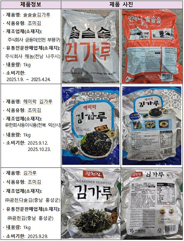 회수 대상은 수입산 단김을 원료로 제조한 주식회사 금동이 '솔솔솔김가루', '가루김까루', 유한회사동이식품(전북 익산시 소재) '해미락 김가루', ㈜광천다솔김(충남 홍성군 소재) '김가루' 4개 제품이다.