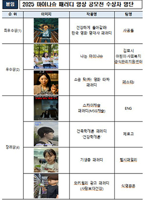 우수상은 인기 있는 예능프로그램을 패러디해 원작의 재미를 살리면서 다양한 방식으로 나트륨·당류 줄이기 메시지를 전달한 '김포시 어린이·사회복지 급식관리지원센터'팀의 '나는 마이나슈' 작품 등이 선정됐다.