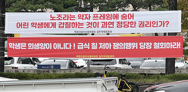 현수막에는 '급식 질 저하 쟁의행위 당장 철회하라'는 내용과 '노조라는 약자 프레임에 숨어 어린 학생에게 갑질하는 것이 정당한 권리인가?'라는 비판적 글이 적혔다.