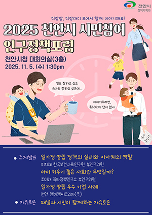 [문화투데이 장은영 기자] 남 천안시는 다음 달 5일 시청 대회의실에서 '2025 천안시 시민참여 인구정책포럼'을 개최한다고 29일 밝혔다.