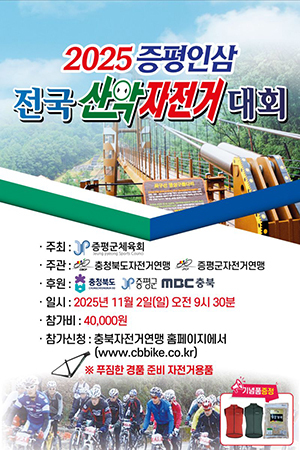 [문화투데이 황재연 기자] 충북 증평군은 '2025 증평인삼 전국산악자전거대회'가 다음 달 2일 율리휴양촌과 좌구산 일원에서 열린다고 29일 밝혔다.