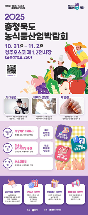 [문화투데이 황재연 기자] 충북도는 오는 31일부터 다음 달 2일까지 사흘간 청주오스코에서 '제1회 충북도 농식품산업 박람회'를 연다고 30일 밝혔다.