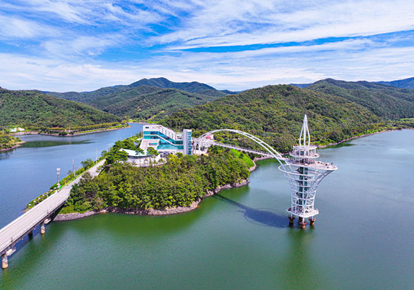 관광객들은 출렁다리를 걸어 57m 높이의 스카이워크 전망대에 올라 칠갑호 주변 풍광을 한눈에 내려다볼 수 있다.