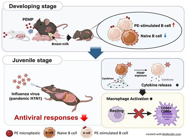 실제 미세플라스틱에 노출된 새끼 생쥐에서 면역을 담당하는 T세포와 NK세포(자연살해세포)가 줄어들고, 염증을 일으킬 수 있는 B세포가 비정상적으로 늘어나는 등 면역체계의 균형이 무너진 모습이 확인됐다.