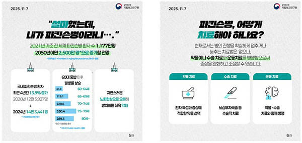 질병청과 보건연구원은 파킨슨병에 대한 국민 이해를 높이기 위해 카드뉴스를 제작하고 이번 연구 결과를 비롯한 파킨슨병 코호트 사업의 성과를 공개하는 한편, 파킨슨병 환자용 건강관리앱(닥터 파킨슨)을 통한 자가 진단 방법을 누리집에 공개했다.