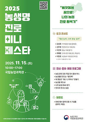 [문화투데이 황재연 기자] 농촌진흥청은 오는 15일 농업과학관에서 '2025년 농생명 진로 미니 페스타'를 개최한다고 11일 밝혔다.