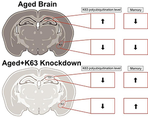 분석 결과 K63 폴리유비퀴틴화 수준이 해마에서는 나이가 들수록 증가하고 편도체에서는 감소하는 것으로 나타났다. 이어 크리스퍼 유전자 편집도구(CRISPR-dCas13)로 해마와 편도체의 K63 폴리유비퀴틴화 수준을 낮추자 늙은 쥐의 기억력이 향상되는 것으로 확인됐다.