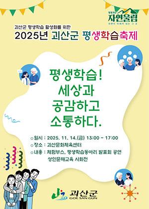 [문화투데이 황재연 기자] 충북 괴산군은 오는 14일 괴산문화체육센터에서 주민과 함께하는 '2025년 괴산군 평생학습축제'를 개최한다고 12일 밝혔다.