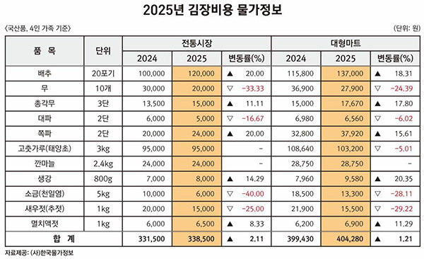 16일 전문가격조사기관인 한국물가정보에 따르면 지난 14일 기준 김장재료(4인 기준)를 전통시장에서 구매한 비용은 33만8천500원, 대형마트는 40만4천280원으로 각각 작년보다 2.1%와 1.2% 증가했다.