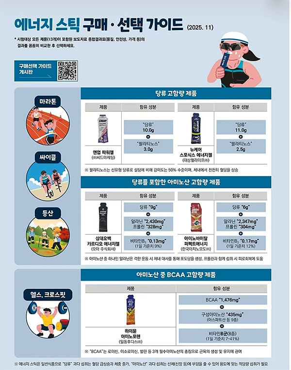 [문화투데이 황재연 기자] 소비자들이 운동 중 에너지 보충용으로 찾는 '에너지 스틱'은 제품별 영양 성분 함량 차이가 큰 것으로 나타났다. 한 포당 가격 차는 제품별로 최대 3.6배에 달했다.