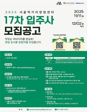[문화투데이 김태균 기자] 서울시는 '서울먹거리창업센터'에 새로 입주할 기업을 내달 2일까지 모집한다고 20일 밝혔다.