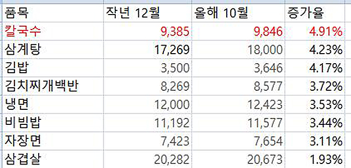 칼국수는 같은 기간 9천385원에서 9천846원으로 4.91% 올라 상승 폭이 가장 컸다.