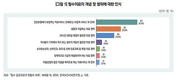 이에 따르면 '필수의료에 가장 가까운 것은 무엇이라고 생각하는가'라는 질문(객관식)에 가장 많이 나온 응답은 '건강보험에서 보장하는 의료서비스 전체(또는 비급여 서비스 외 전부)'로 41.3%였다.