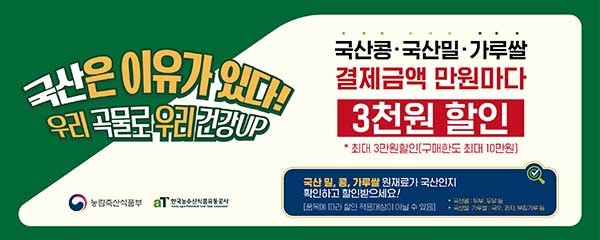 [문화투데이 장은영 기자] 한국농수산식품유통공사(aT)는 농림축산식품부와 24일부터 다음 달 15일까지 국산 밀과 콩, 가루쌀로 만든 제품의 소비 촉진을 위한 할인 행사를 한다고 밝혔다.