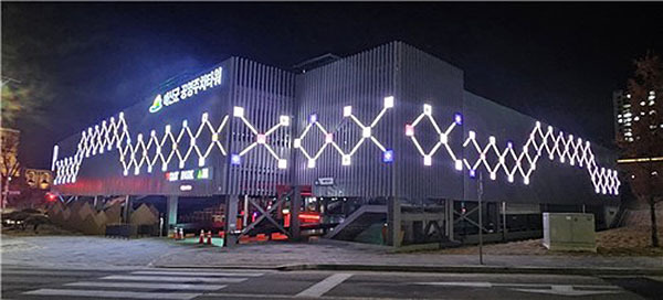 군청 주차장과 이어져 있고, 외벽에는 밤하늘 은하수를 형상화한 경관조명이 설치됐다.