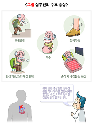 심부전 초기에는 조금만 움직여도 숨이 차거나 누우면 호흡이 어려워지고, 다리나 발이 붓거나 체중이 갑자기 늘기도 한다. 피로감, 식욕 감소, 복부 팽만, 밤중 잦은 배뇨, 기억력 저하 등의 증상이 나타날 수도 있다. 노년층은 이러한 증상을 단순한 노화나 피로로 오인하고 적기에 병원을 찾지 못하는 경우가 많다.