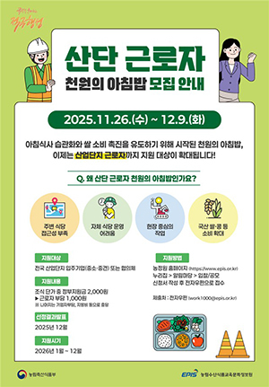 '천원의 아침밥 사업'은 아침 식사 결식률이 높은 청년층과 먹거리 접근성이 취약한 산단 근로자에게 우리 쌀을 이용한 아침 식사를 1천원에 제공하는 식생활 돌봄 정책이다.