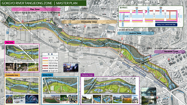 하천을 단순한 치수 중심에서 벗어나 시민의 여가와 생활 체육, 자연 생태가 어우러진 복합 문화 공간으로 확장하기 위해 대상지를 네 가지 주제로 구성했다.