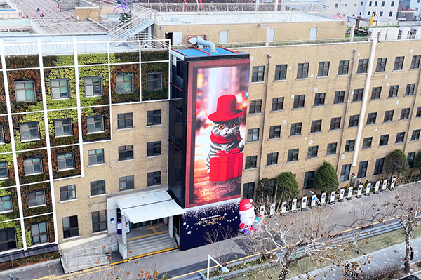 서관 엘리베이터 외벽에 설치된 대형 미디어캔버스(폭 6.5m, 높이 15m)에 입체감을 느낄 수 있는 '산타 고양이'가 나타나자 전시장 곳곳에서 신기하다는 듯 탄성이 잇따랐다.