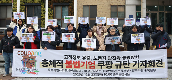 이들 단체는 충북도청 앞에서 기자회견을 열고 "쿠팡은 3천370만명의 이름, 주소, 전화번호 등이 통째로 유출됐음에도 제대로 된 사과는커녕 청문회에 외국인 임원을 내세워 책임을 회피하는 촌극을 보였다"며 "이것이 천문학적인 수익을 올리고, 수천만 명의 국민을 회원으로 둔 글로벌 기업의 태도가 맞느냐"고 비판했다.