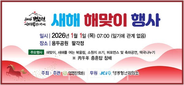 [문화투데이 황재연 기자] 충북 영동문화원은 새해 첫날 오전 7시 용두공원(영동읍 매천리)서 '2026 해맞이 행사'를 연다고 26일 밝혔다.