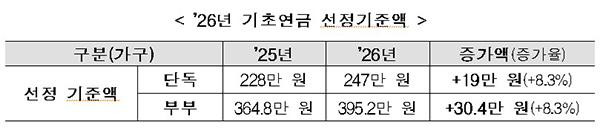 2026년 선정기준액은 2025년 대비 19만원(단독가구 기준) 높아졌다.