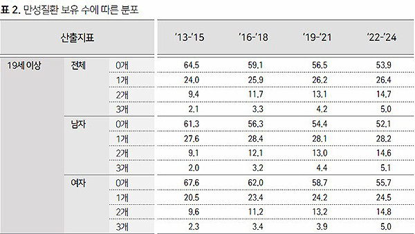 2024년 기준 국내 성인의 단일 만성질환 유병률은 26.4%로, 4명 중 1명꼴이었다. 2013년 24.0%에서 소폭 늘었다.