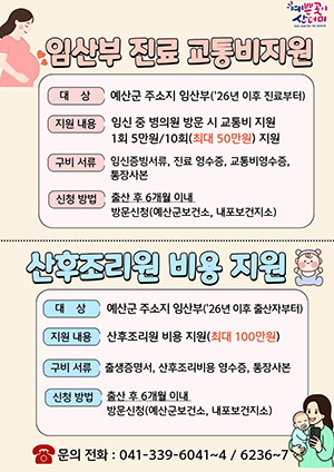 [문화투데이 장은영 기자] 충남 예산군은 임산부들의 산부인과 진료 교통비와 산후조리원 이용 비용을 지원한다고 8일 밝혔다.