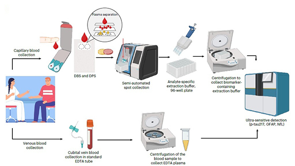 이를 위해 유럽 7개 연구기관에서 337명이 손가락 끝에서 채혈해 건조한 혈액 또는 혈장 샘플을 제공했으며, 이들은 동시에 비교를 위해 정맥 채혈과 일부는 뇌척수액(CSF) 검사도 받았다.