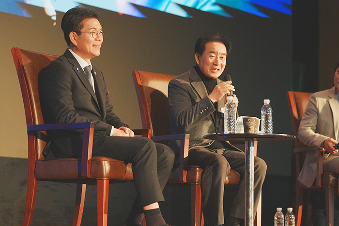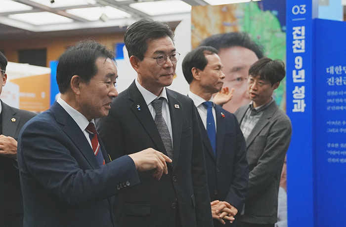 이어 정원오 서울시 성동구청장과 송 군수의 토크콘서트가 진행됐다. 정 구청장은 “출판기념회가 아닌 책의 내용을 전시로 풀어낸 방식이 인상 깊었다”며 “진천형 통합돌봄과 케어팜 등은 우수 정책으로 벤치마킹하고 있다”고 말했다.