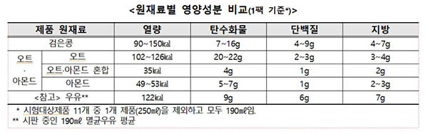 또 제품 중 9개는 칼슘을 첨가했는데, 칼슘 함량은 검은콩두유가 21∼153㎎, 아몬드·오트 음료는 128∼307㎎으로 1일 영양성분 기준치의 3∼44% 수준이었다.