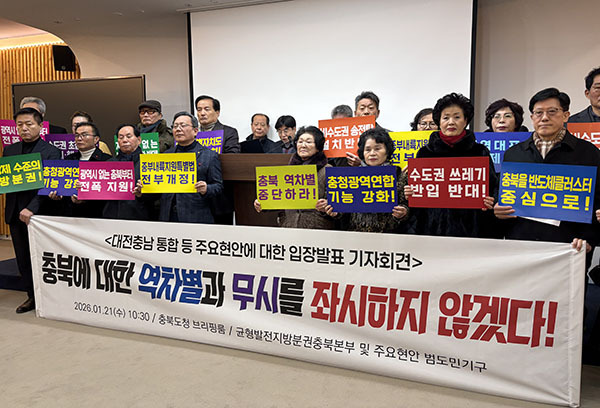 이어 "일방적인 광역시도 행정통합에 반대하는 동시에 소외된 충북을 비롯한 중부내륙의 발전을 위해 중부내륙지원특별법 전부 개정과 충북특별자치도 설치 및 지원법 제정을 통해 전폭적으로 지원할 것을 정부와 정치권에 강력히 요구한다"고 덧붙였다.